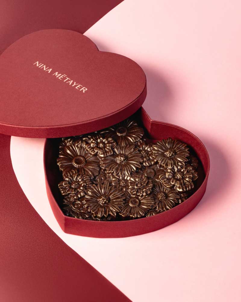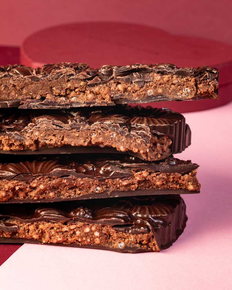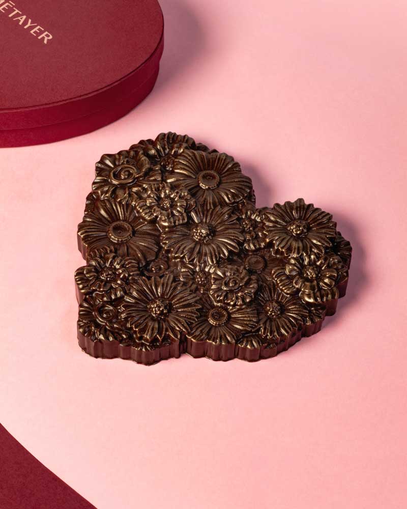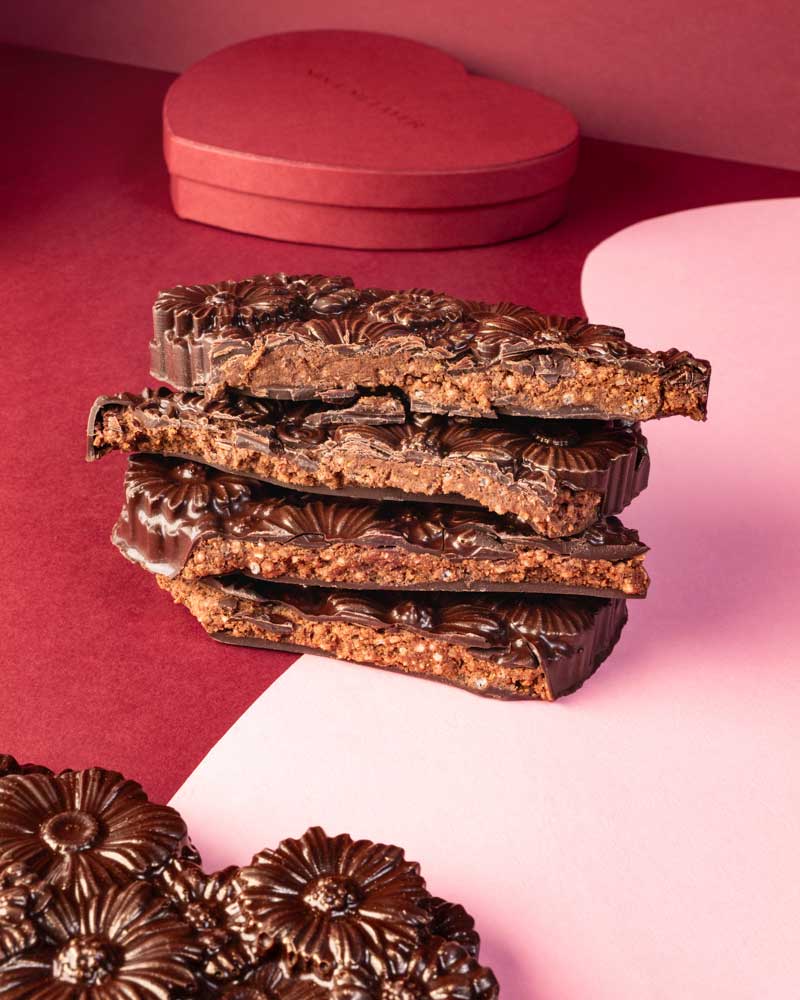 Beaucoup, passionnément… Cette généreuse tablette à partager, comme une déclaration gourmande, cache sous sa jolie coque fleurie en chocolat noir, un praliné chocolaté au sarrasin et au riz soufflé… De la douceur et du caractère avec cette petite part de mystère qui évoque l’amour.