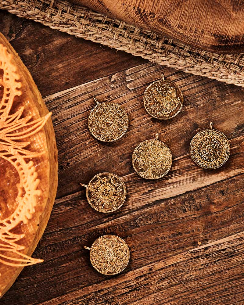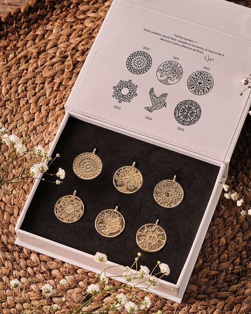 Entre émotion, savoir-faire et voyage gourmand, Nina signe sa toute première collection exclusive de fèves qui raconte l’histoire des tuiles ouvragées de ses emblématiques galettes des rois : Renaissance 2020 en hommage à Notre-Dame, l’Arbre de vie 2021, Casse-Noisette 2022, La Couronne 2023, L’Envol 2024 et La Boussole 2025. Comme autant de petits bijoux à collectionner, elles prolongent la magie des moments partagés en famille et entre amis. Grâce à leur attache discrète, elles se transforment en pendentif, pour garder ces beaux souvenirs tout près de soi.