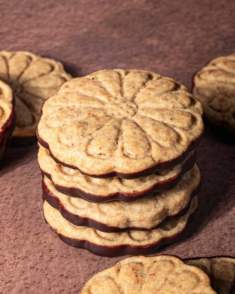 Ces petits sablés évoquent les souvenirs d’enfance de Nina et ses Noëls en Alsace. Le goût des épices et du chocolat s’accorde à merveille avec tous ces moments partagés au cœur de l’hiver, les déjeuners qui se prolongent, les longs après-midis rythmés par les jeux de société et les goûters, les soirées devant la cheminée… Certains ne résistent pas à la tradition, très britannique, de tremper ce biscuit quelques secondes dans une tasse de café ou de thé.