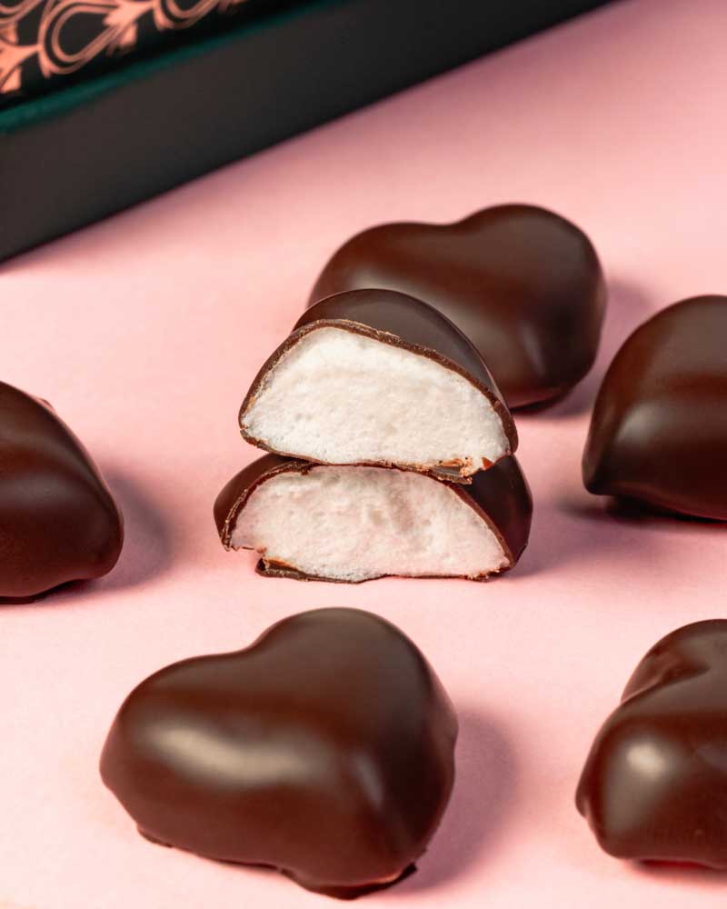 Toute la tendresse très régressive de la guimauve enrobée de chocolat noir dans une version romantique ! A déguster à deux, comme à partager avec ceux que l’on aime.